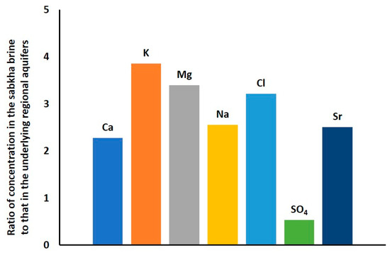 Ratios of the major element concentrations for the upwelling regional brine relative to the brine in the sabkha Matti.