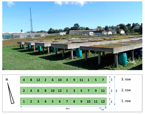 Setup of the field campaign in Hanover-Herrenhausen with 36 green roof test plots in total (12 superstructures used). The picture shows rows 2–6. Runoff from green roofs is collected in rain barrels.