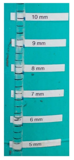 Transparent plastic tube with water level. Scale was calibrated in the laboratory on the 4 m2 test field (4 L = 1 mm; accuracy (± 2 mL).