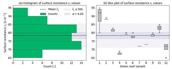Surface resistance calibration for different green roof variants. (a) Histogram of surface resistance values. (b) Box plots of surface resistance values achieved for each green roof variant. The green line shows the average surface resistance of 78 s m−1, the shaded area corresponds to the α = 0.05 confidence interval of the mean value , and mean value standard deviation, respectively.