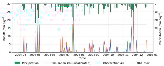 For the uncalibrated model, the default parameter values from the literature review were applied [,]. Simulation and observation show similar patterns in terms of timing and variability of the time series, but the simulation overestimates the runoff. Results for green roof variant #6 are visualized in Figure 4. The value for the objective function, more specifically, the Kling–Gupta efficiency (KGE), is 0.57.