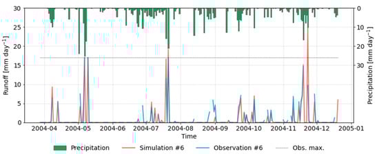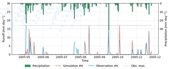 Observed and simulated runoff obtained during validation of the model (obs. Max.: measurement limit of 17 mm).
