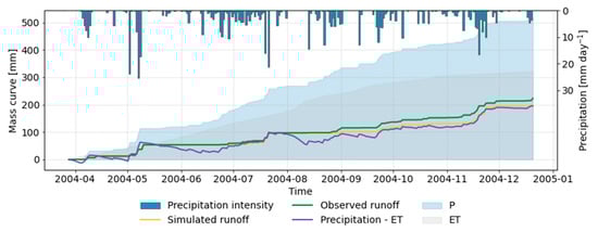 Figure 6 shows the water balance for the calibrated model setup in terms of mass curves. Both observed and simulated runoff are displayed, as well as the difference between precipitation and evapotranspiration. The results refer to green roof variant #6 and highlight that the calibrated model matches the observed time series very well. Total runoff is satisfactorily represented in the experiment.