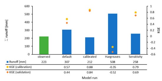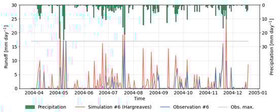 For reasons of comparison, the model was also calibrated and run using the original Hargreaves method, which is already implemented in EPA SWMM. Similar to the previous runs, runoff time series for green roof variant #6, obtained from the EPA SWMM setup with the Hargreaves method, are presented in Figure 7. The simulation does not only overestimate total runoff but also runoff variability. The Kling–Gupta efficiency (KGE) is −0.35, suggesting that the Penman–Monteith approach clearly outperforms the Hargreaves method in case of our test site.