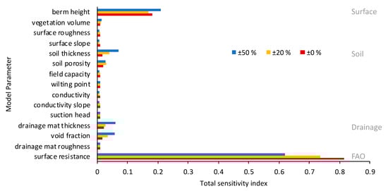 The results of the global sensitivity analysis are presented in terms of the total sensitivity index (with a maximum of one, see Section 2.4). According to the sensitivity analysis, the model is most sensitive towards the following parameters: surface resistance and berm height. The computed sensitivity index is smaller for soil thickness, soil porosity, drainage mat thickness, and drainage mat void fraction, indicating that these parameters are less important in our experimental setup (Figure 9).