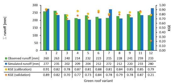 The validation of the calibrated model (Section 3.2.2.) shows similar patterns between observation and simulation, but the simulation sometimes underestimates the runoff. Results for green roof variant #6 are presented in Figure 8. The Kling–Gupta efficiency (KGE) is in this case equal to 0.84, which is a value close to the corresponding value achieved for model calibration (KGE = 0.88). Table 3 also confirms that runoff characteristics are presented well by the model, even though the longest dry period is also overestimated in the validation period (the event in late July is not captured by the model). However, it is assumed that the model shows predictive skill outside the calibration period, since the performance measures of the validation period reflect a similar accuracy as those values achieved in the calibration period (Table A2 in the Appendix A)