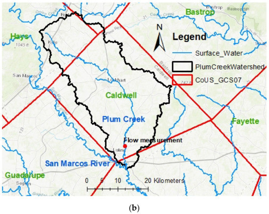 (a) Location of Plum Creek Watershed in TX, USA (b) Detailed location of the watershed, streams, counties and cities (Red line shows county boundary).