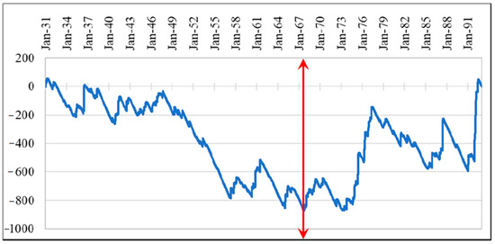 Hydrologic alteration for the Plum Creek watershed indicated by the change points. The maximum deviation of daily streamflow from the mean is shown by the red line with arrows corresponding to 20 September 1967. The first noticeable major change in flow occurred during the end of 1955. The flow data was monitored at Luling, Texas (United States Geological Survey (USGS) Gaging Station No. 08173000).