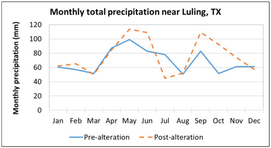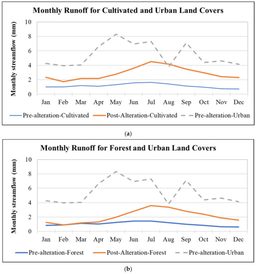There was an increase in precipitation (by 10%) during the post-alteration period (annual average value 907 mm) than pre-alteration (822 mm). The increases in precipitation during post alteration was not consistent throughout the year. Instead, specific months (May, June, and September) exhibited noticeable increases in precipitation (Figure 4). However, precipitation in July during post alteration showed declines (Figure 4). Therefore, changes in precipitation magnitude (mostly increases) and changes in precipitation pattern (increases in May, June, and September and declines in July) in post-alteration when compared to pre-alteration period is one of the reasons for the hydrologic change in Plum Creek. However, there are other reasons, such as the land cover change, that could have played a significant role in the hydrologic alteration, eventually, of the stream health. The Hays county (The upper North Western portion of the watershed where most of the present urbanization is seen (Figure 1 and Figure 2)) until the 1950s (specifically 1846–1955) was mostly rural with ranches raising cattle, sheep, and deer relying primarily on the Blackland prairies. Later they identified the land as suitable for cultivating cotton. Some other crops were added to their list as the years went by. The land cover in the 19th century and the first half of the twentieth century in Hays county was documented in the National Register of Historic Places, 2004 [35]. Significant urbanization that occurred in the upper northwestern and central parts of the watershed during the latter part of the 20th century is the probable reason for the increased value of hydrologic indicators affecting stream health in the watershed. The streamflow to precipitation ratio during post alteration (0.15) was higher than the pre-alteration period (0.12), which indicates that most of the changes in flow during post-alteration are resulting from factors other than changes in precipitation. Figure 5 showing a comparison of streamflow values from cultivated land, forest, and urban area substantiates the fact that increased streamflow in the Plum Creek was mostly due to changes in land cover (mainly urbanization), although some increases in streamflow were attributed to the increased precipitation during post-alteration period.
