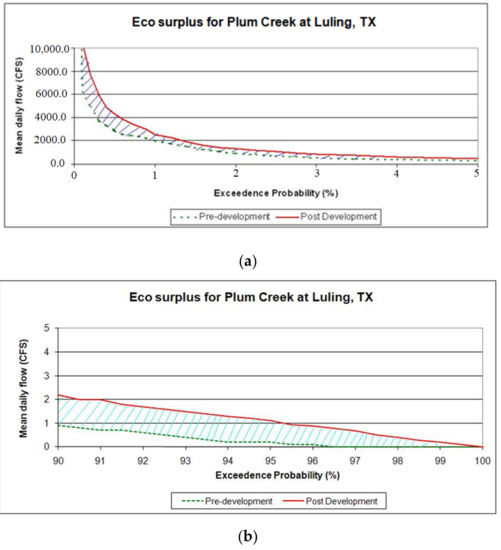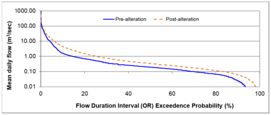 A simple method for investigating the presence/absence of a stream health problem using the FDC-based eco-deficit or eco-surplus method [22] was used in this study. Whether higher (surplus) or lower (deficit), any significant change in streamflow impairs stream health status in relation to the duration, timing, magnitude, rate of change, and frequency [36]. The FDCs for the pre- and post-alteration periods for the Plum Creek watershed (Figure 6) indicated the existence of large eco-surplus in both high and low flows, which correspond to the minimum to moderate severity of stream health issues.