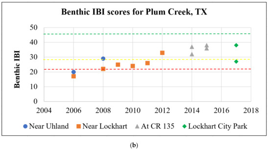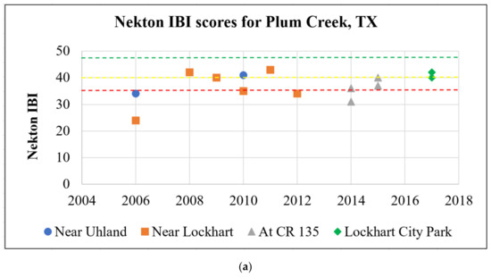 (a) Nekton Index of Biotic Integrity (IBI) scores for the Plum Creek watershed observed in different locations (Stream classification categories for aquatic species: Below the red line: Limited, Between red and yellow lines: Intermediate, Between yellow and green: High, Above green: Exceptional); (b) Benthic Index of Biotic Integrity (IBI) scores for the Plum Creek watershed observed in different locations (Stream classification categories for aquatic species: Below the red line: Limited, Between red and yellow lines: Intermediate, Between yellow and green: High, Above green: Exceptional).