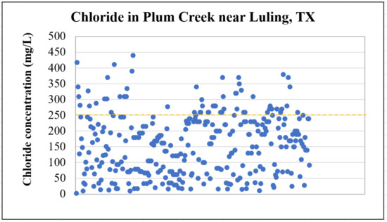 Chloride concentration in Plum Creek observed near Luling, TX, from 1961 to 1986. (250 mg/L (shown as the orange line) is the drinking water standard and the chronic exposure levels for aquatic species).