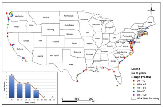 The 1970s shift years detected in this study are well documented in previous studies []. Further, Woodsworth et al. [] also found positive acceleration related to an ‘inflexion’ point in the US tide gages in 1930. The determination of time of occurrence of sudden changes in time series aids researchers to find the evidence of natural or anthropogenic changes in climatic, hydrologic, or land use. In addition, the abrupt shift could also be due to non-homogeneity in the dataset which is often affected by the moving of the stations. The significant shift years also represent non-stationary behavior in sea level records. Therefore, it is very important to identify the period from where significant change has occurred in sea level record. In the current study, summer season showed a maximum of the station showing a shift in all categorized years with a maximum of 40 stations in 1991–2000. However, few nearby stations are observed in the different shift year range which could be due to the variable record length used in this study.