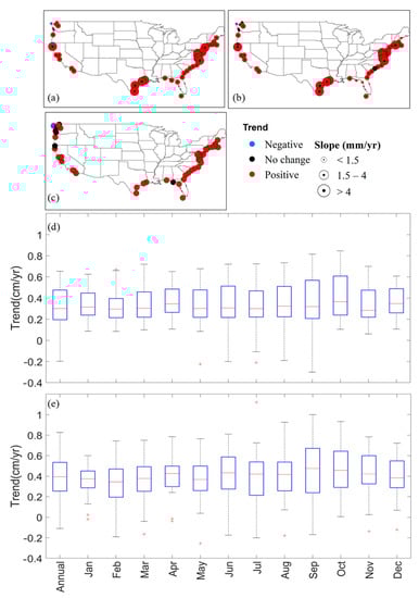 The magnitude of the trend was computed by utilizing the TSA slope for significant stations showing a trend at the level of significance, p ≤ 0.05. The maximum and minimum trend magnitude was 0.85 cm/year for October and 0.62 cm/year for January month, respectively as shown in Figure 2d using the entire dataset. Each whisker shows the outliers, each red line shows the median, and each box represents the values within the 25th and 75th percentile of the sea level trend magnitude for each month. The results of sea level indicate that the magnitude of sea-level starts increasing from May with slight fluctuations through September. It was noteworthy that the annual and monthly median was above zero. The maximum annual trend slope along the US coast was 0.64 cm/year whereas the minimum trend magnitude was −0.20 cm/year using the entire data.