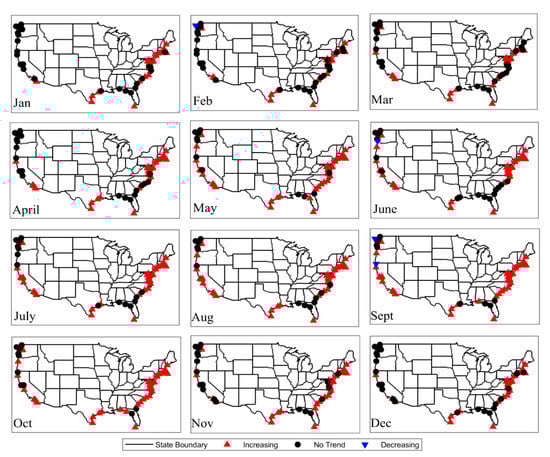 Spatial plots showing the MK2 trend significance of monthly sea level along the coastal US accounting STP. The red upward arrow represents an increasing/positive trend whereas the blue downward arrow represents a decreasing/negative trend. The black dot represents stations showing no trend at the statistical significance of p ≤ 0.05.