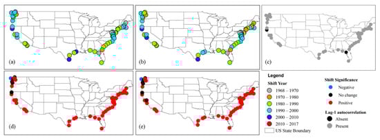 Spatial plots showing the results for the shift of annual sea level along the coastal US. Represents (a) Shift year before accounting for autocorrelation (b) Shift year after accounting for autocorrelation (c) Lag-1 autocorrelation (d) Shift significance year before accounting for autocorrelation (e) Shift significance year after accounting for autocorrelation. The red circle represents an increasing/positive trend whereas the blue downward arrow represents a decreasing/negative trend. The black dot represents stations showing no trend at the statistical significance of p ≤ 0.05.