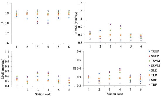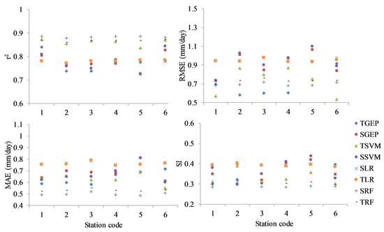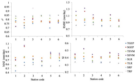 A breakdown of the models’ performance accuracy at each station is shown in Figure 2, Figure 3 and Figure 4 for all of the three input combinations, respectively. In the case of the temperature-based combination (Figure 2), the local GEP and SVM models (shown as TGEP and TSVM) gave more accurate results than the spatial (shown as SGEP and SSVM) models. For the LR and RF models, the difference in accuracy between local (TLR and TRF) and spatial approaches (SLR and SRF) was not significant and both showed better performance than GEP and SVM models since they relied on the patterns of the same location used for training and testing the models. According to Table 2, station 6 (Fargo) had the highest, and station 2 (Galesburg) had the lowest range of recorded temperature among the study stations. This range may be caused to have the lowest performance for station 2; however, it was difficult to evaluate the model’s performance in the climate context of each station due to the few number of study stations. The RF model showed the best performance with higher accuracy for all stations either locally or spatially, and the spatial SVM and GEP illustrated the lowest performance among other models and approaches.