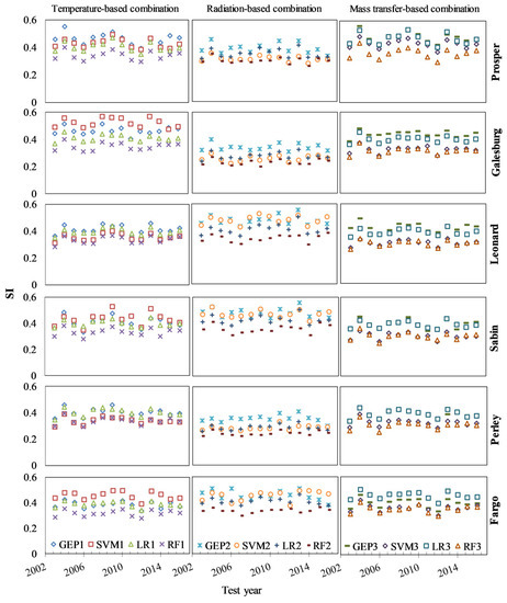 As shown in Figure 5, the SI values fluctuated considerably within test years for all input combinations and approaches. Among the study stations, Prosper and Sabin stations showed the average maximum range for the SI values. The minimum average of the SI value 0.223 was observed for the RF radiation-based combination for the Fargo station, and the maximum average of the SI was obtained for the SVM temperature-based combination (SVM1) for the Galesburg station. The Galesburg station had the lowest temperature range among the study stations. According to Figure 4, the RF2 (radiation-based combination) model showed the lowest fluctuation compared to the other approaches with a similar trend among the study stations. For all of the study stations, test years, and input combinations, the RF models gave the best performance with the lowest SI values compared to the other models and combinations. The SVM and GEP models showed the worst SI averages for the temperature-based combinations. In this case, the order of the accuracy of the models was similar to that obtained from the station-based analysis. The radiation-based combination gave the most accurate results and estimation in comparison with the temperature or mass-transfer-based combination models.