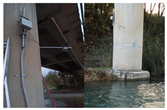 The HCMR stations are installed under bridges as shown in Figure 1. The solar panel used for the power supply of the water station was placed at a high point with abundant sunlight on the vertical abutment (pier column), while the instrument with the sensors was placed in the water in a safe position near the pier’s bottom.