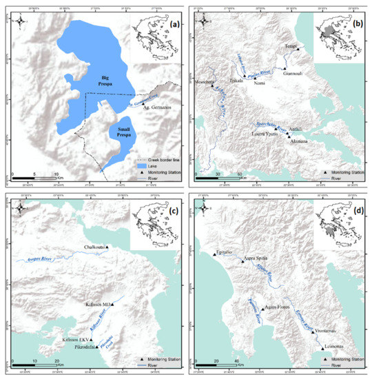 Spatial distribution of HCMR water quality monitoring network in selected Greek rivers up to December 2020: (a) the station in Ag. Germanos stream, (b) the stations in Acheloos, Lithaios, Pinios and Spercheios rivers, (c) the stations in Asopos and Kifissos rivers and in Pikrodafni stream and (d) the stations in Alfeios, Evrotas and Pamisos rivers.