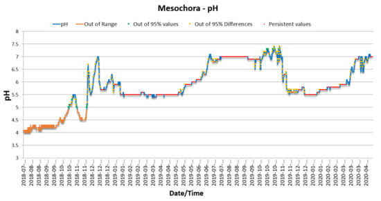The measurements that passed the quality checks without being indicated with any possible error were 43.59%. Almost 84% of the recorded values were within the allowable limits of this parameter (5 < pH < 10, see Table 3), while when checking for possible persistent values for an extended period, possible errors were detected in about 37% of the measurements, which makes this type of error the most important and most common in the pH data set. At the left part of the graph the orange color results from the implementation of the range test. The test found that for a long period of more than two months all the recorded values were out of range, specifically pH was less than 5 (lower allowable bound), which did not allow further examination with one of the other tests. Then, a period with more acceptable values of pH began that lasted until early 2019. For the remaining “within-the-permissible-limits” raw data, the selected tests detected the 5% of the values, which lay below the 2.5% and above 97.5% percentiles (green), and outside the respective percentiles of the value differences (yellow). For the former and specifically for the above 97.5% values, which were found in late 2019 and were all close to pH = 7, there did not seem to be any suspicious recording. The 2.5% lowest pH values appeared at the end of 2018 and were slightly greater than five succeeding the period with out-of-range values. These “green” values are however suspicious and should not be uncolored. The yellow symbols are interchanged with normal blue values, indicating fluctuations for further observation. In fact, all yellow symbols in Figure 3 corresponded to the 2.5% larger sequential (1 h) differences and should be carefully observed for potential unexpected hourly pH increases/decreases. On the other hand, the rest of the 2.5% of “yellow” data, representing the minimum hourly changes, are “lost” under the persistent values that are marked with the stuck value test. Indeed, measurements that persist at specific values for a long time (red color) are observed in several parts of the graph indicating that the sensor was probably not working properly and was stuck many times within the 20-month period. Obviously, the 2.5% lowest changes were zero changes that coincided with persistent values checked with red. As shown in Figure 3, the zero changes in pH values for long periods were met more in 2019 but continued in 2020, sometimes for shorter periods and sometimes for longer ones. The sensor returned to normal function mostly after a calibration and/or a maintenance visit to the station. Overall, the pH graph of Figure 3 for the Mesochora station shows problematic behavior that needs to be further interpreted through station and sensor checks.