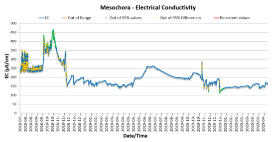 Change of electrical conductivity (EC) (blue line) on an hourly basis at Mesochora station and flagging of values, which are outside the 2.5% and 97.5% percentiles of observations (green color) and outside the 2.5% and 97.5% percentiles of absolute differences of consecutive observations (yellow color). No out of allowable range EC values (orange color) or unchangeable EC values for more than two days of continuous recording (red color) have been indicated.