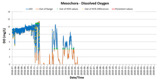 On the contrary, the majority of DO hourly records within the 20-month period of interest did not pass any quality check as records from May 2019 and onwards were empty. Moreover, a significant percentage of the recorded values before May 2019 are possibly in error. As shown in Figure 6, there are significant parts of the time series outside the allowable range (orange color). These erroneous data are systematically observed in the graph where many values lie below the lower limit, even reaching zero. However, the measurements return within the allowable limits, which means that the sensor works, implying that a phenomenon (probably pollution) causes the DO high fluctuations. There is a period at the end of 2018 characterized by the largest fluctuations in successive value differences (yellow color), which though, based on the general behavior of the parameter, may be reasonable. The biggest problem of the data set is the long period with empty values (non-recording), which essentially indicates the shutdown of the sensor. This happened as shown in the graph in May 2019 and can be attributed either to a problem with the sensor itself or with a station damage/removal. However, as other parameters have been recorded during the same period, it is obvious that the station suffers from a DO sensor failure that was not repaired until the end of the 20-month study period. Overall, the graph of Figure 6 for the Mesochora station reveals a rather suspicious operation of the DO sensor with no recording for almost a year and with high fluctuations lying out of allowable limits when recording. The DO sensor is characterized by low durability and needs more frequent maintenance/calibration or even replacement.