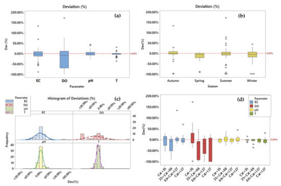 Percentage deviations of automatic station measurements from in situ measurements: (a) per water quality parameter: EC (electrical conductivity), DO (dissolved oxygen), pH and T (temperature), (b) per season, (c) per parameter showing the frequency of each deviation level and (d) per parameter and time period (in days) elapsed from the previous on site sensor calibration.