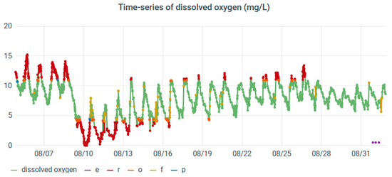Graph showing the fluctuations of water dissolved oxygen (DO) over time with flagged data based on the quality checks of range, extreme value, extreme difference value and stack value tests, as shown in the HCMR online platform. Symbols: “e” for empty values, “r” for out-of-range values, “o” for outliers (the 5% highest and lowest values of the time-series), “f” for high and low fluctuations (5% of highest and lowest changes of consecutive values) and “p” for persistent values (no change of the parameter value for at least 48 hourly measurements).