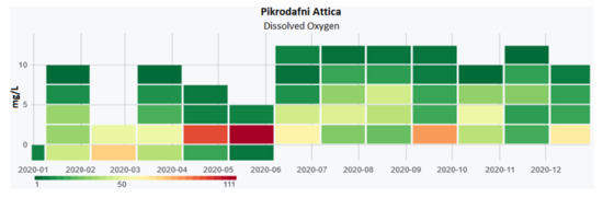 An additional visualization product available in the platform is the “heat map”, a data visualization technique that shows the magnitude of a phenomenon as color in two dimensions. The heat map provides a rapid overview of the fluctuation of a parameter’s values for long periods of time (months, years). As shown in Figure 10, the number of measurements existing in each rectangle of the diagram is indicated in the lower left corner (few measurements—green, many measurements—red). So, in the example heat map of the figure, referring to the monthly observations at the small Pikrodafni stream in Attica, most low DO measurements (0–2 mg/L) occurred in May and June (red rectangles) and only a few measurements reached the levels of 4 mg/L and 6 mg/L (green and dark green rectangles). Then, DO values began to fluctuate throughout the natural value range (up to 11 mg/L) in summer, with the majority of values being below 4 mg/L though. This wider variability continues with a rather more uniform distribution of measurements in the last two autumn months.