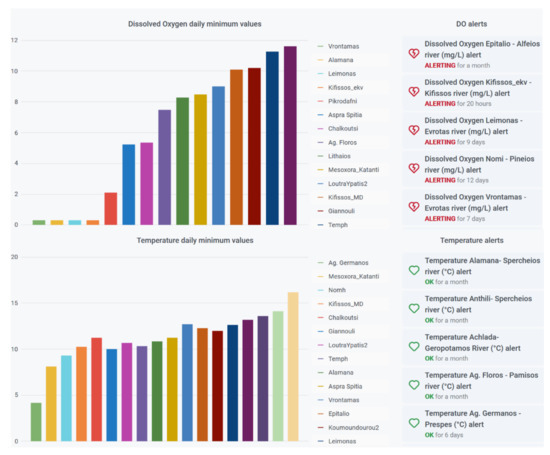 Another interesting functionality in order to ensure the smooth and uninterrupted operation of the network of the automatic monitoring stations is the alerting service provided within the online grafana platform and is presented in Figure 11. For each parameter and station if the value exceeds the upper/lower acceptable limits, the system transmits (via e-mail) an alert message. Bar charts of the minimum daily values of each parameter recorded across the entire monitoring network of stations were also calculated and displayed on a daily basis for a better network’s overview.