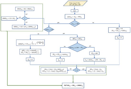where k is the latitude-dependent correction factor accounting the number of days in the month and the actual number of hours of insolation; I is the annual heat index; a is a coefficient strictly proportional to I. For the computation of the actual evapotranspiration (AET, millimeters), the soil moisture storage capacity must be selected in reason of the soil and crop type [,]. After that, according to the difference between monthly precipitation and PET (millimeters) the soil moisture content changes to satisfy the water request from the soil system. The water surplus is generated only after the soil moisture conditions are satisfied and the temperature is above a rainfall–snowfall threshold (generally temperature >−1 °C) []. The runoff factor (beta) is the percentage of the monthly water surplus implied in the generation of the basin runoff, and it is usually settled equal to the 50% of the monthly water surplus []. In fact, following the classical rational method, it depends on surface cover and it is a constant value, strictly related to the percentage of impermeable catchment area [,,]. Other authors have demonstrated a seasonal variability of the beta parameter over different climatic regions []. Although the setting of the runoff coefficient and soil moisture initial conditions is extremely important for predicting catchment response, this work aims to merely present an online application, which speeds up a widely accepted routine, and it does not consider the calibration of such parameters. The issue related to the snow accumulation and its melt rate is avoided through a simple mass balance. In fact, the snowmelt is generally calculated through energy balance methods or physical-based approaches, which require the availability of several meteorological and hydrological input parameters, which are usually difficult to acquire []. The steps involved in the calculation are summarized in the workflow presented in Figure 1. Using this method, it is possible to calculate the components of the water cycle according to the Thornthwaite–Mather method and, in addition, the monthly snowmelt runoff (SMRO, millimeters) and the monthly total runoff (TOT RO, millimeters).