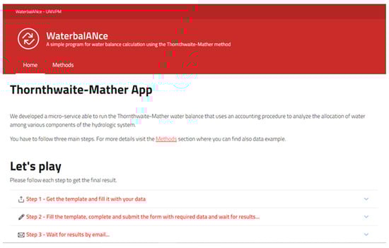 The implementation of a WebApp for automatic water balance calculation allows the users to more efficiently carry out computation for large datasets. End-users will be provided with a template where data can be easily uploaded. The use of a serverless approach also represents a new means of processing data in case of scientific use. Data (input and output) are managed through several cloud services decoupling each component, also enabling automatic scalability. An Excel spreadsheet file and a graphical plot are sent to the users by e-mail, allowing the process to be run several times using different input parameters. Thanks to this automatic procedure for water balance calculation, it is possible to more quickly test the applicability of the Thornthwaite–Mather method in different geological and hydrogeological contexts and to discuss the important issue, which deserves to be studied in greater depth. In fact, in contrast to the classic MS Excel spreadsheet file, where time is proportional to the amount of data, the use of a WebApp permits the execution of the Thornthwaite–Mather method in a few minutes, regardless of the amount of input data. Moreover, no additional software modules need to be installed, and this simplifies the interaction with the final user, who can focus on the analysis of data. The availability of the source code as a public git-hub repository is useful for users who wish to integrate the developed algorithm into their pipeline. Future improvements of the WebApp may involve consideration of fraction of monthly precipitation that becomes snow, the function of the temperature, geographic location, elevation, and the aspect, as suggested by [], in addition to testing the method in different contexts. For example, particular attention should be paid to the infiltration process in the soil or even in soil-less situations to improve the calibration of input parameters. The soil moisture storage capacity (SM) and the beta parameters, which influence the model discharge performance, should be improved by an automatic calibration procedure in order to minimize the associated mean absolute error between modelled and measured discharge. Once the calibration is performed on a basin with certain physical characteristics (e.g., soil and crop type, land use, morphometric characteristics, and lithology), the parameters obtained can aid in the simulation of the discharges of ungauged watersheds for water management.