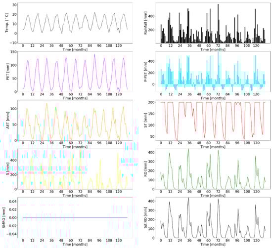 Example of the output plots. Months are plotted against the inputs (P, Tm) and output variables of the program.