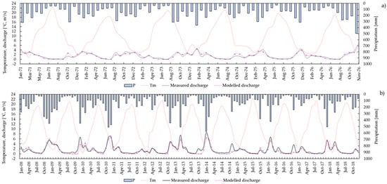 Comparison of mean monthly measured and modelled discharge, monthly precipitation, and mean monthly temperature data for time series I (a) and II (b).
