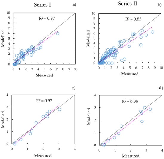 Table 1 shows the basic statistical results for the analyzed time series, with particular attention given to the model’s results and the hydrological conditions during the monitoring period. As supported by the Pearson’s coefficient of determination (Figure 7), the measured and modelled statistical parameters are extremely similar to one another. For instance, the mean discharge values for both the time series are quite similar (1.572 m3/s vs. 1.591 m3/s in Series I and 1.389 m3/s vs. 1.599 m3/s in Series II), also confirmed by the median values.