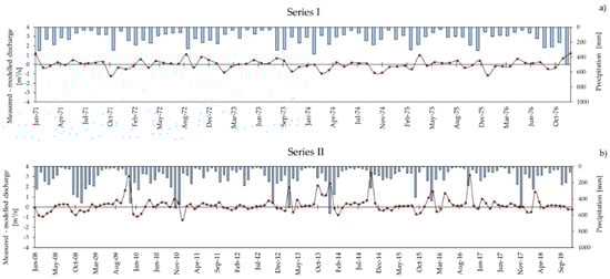 Measured minus modelled discharge and precipitation for time series I (a) and II (b).