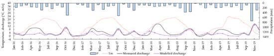 Considering the correlation between the mean monthly measured and modelled discharge data of the whole dataset from January 2016 to December 2019 (Figure 11a), Pearson’s correlation coefficient is equal to 0.39. If the period between April and June for each year (red crosses in Figure 11b) is not considered, R2 is equal to 0.83. This behavior can be explained by the underestimation of the precipitation that falls in solid form using the rain gauge available in the watershed. This discharge regime is classified in accordance with [], as predominately dominated by snow melting; then, the rainfall’s contribution to the water balance is subordinated.