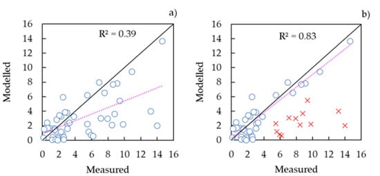 Mean monthly measured vs. modelled discharge data (m3/s) for Savica at Ukanc watershed. (a) All datasets; (b) discarding the months between April and June for each year (red crosses). The dashed line represents the linear data interpolation, while the black solid line is the reference line (1:1).