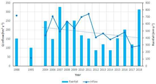 In the hydrological balance, neither the precipitation over the lagoon nor the losses by evaporation have been considered. Given that the average annual precipitation in the period 2008–2018 is about 472 mm and the potential evaporation is 1200 mm [27], the water balance would be negative if considered. In that case, the annual average should reduce the inflow by 0.14 m3 s−1, which is 2% of the total inflow. Therefore, the decrease in flow rate equivalent to the volume of water lost to evaporation is very small in relation to the total inflow.