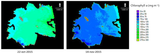 Finally, another case study should be noted: November 2015 when a controlled renewal experience was carried out, providing 10 hm3 of surface water conducted through the canals of the western zone, which presents the least contribution and high residence time. The water flowed for two weeks, with an average total flow in that area of 1 m3 s−1 and possible changes in the area quality water were observed by means of Landsat-8 satellite images estimating the measure of chlorophyll a in the lagoon (Figure 8). These unpublished results showed that a maintained flow contribution through that zone produced a decrease in the concentration of photosynthetic pigments, so the hypothesis that the contribution of good quality water flows could contribute to the improvement of the quality of the lagoon was verified, an aspect that had been discussed during years with the Administration by the experts and that had never been demonstrated experimentally.