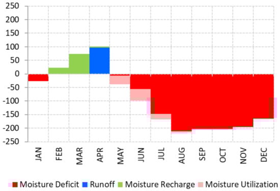 Although average annual rainfall in the region is 998 mm, the annual potential evapotranspiration is 2113 mm, with a Thornthwaite’s aridity index of 0.48, classifying the climate as semi-arid. This type of climate is confirmed by the Köppen climate classification (BS: semi-arid hot), and by the life zone chart introduced by Holdridge, 1968 [], supported by the Food and Agriculture Organization []. This region is characterized by nine months of water deficit (Figure 2), emphasizing its semi-aridity, despite its total annual rainfall.