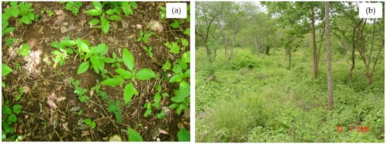 The canopy cover (90%) in the R-SDTF shades the groundcover (30%), limiting its growth (Figure 3a), whereas the sparser canopy cover (60%) in the T-SDTF allows solar radiation to reach the soil and improve the groundcover development (Figure 3b).