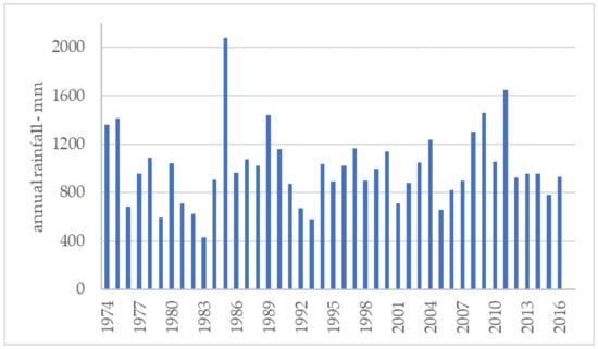 A 1974 to 2017 dataset from the Iguatu, CE, Brazil rain gauge (http://www.funceme.br, accessed on 13 May 2020) was used for the characterization of rainfall events, in the following categories: annual total, monthly distribution, monthly average continuous dry days (CDD) and continuous wet days (CWD), number of dry (DD) and wet days (WD), and mean daily rainfall. The mean annual rainfall for the studied area was 995 ± 305 mm (Figure 4). The temporal distribution of rainfall depth shows 85% to be concentrated from January to May, of which 27% occurs in March, on average.