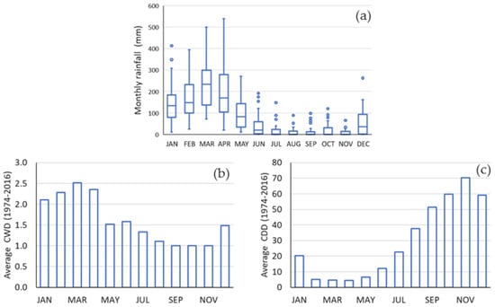 Monthly (a) rainfall; (b) continuous wet days (CWD); (c) continuous dry days (CDD)—1974–2017.