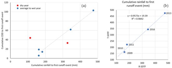 The behavior contributing to the onset of runoff events is evident for the wet years 2009 to 2011 and the average years 2013 and 2016, but none can be spotted for the dry years 2015 and 2017 (Figure 9a). In average and wet years, there is a linear relationship between cumulative rainfall for the onset of the first runoff event and CDD. More CDD in dry years results in more water loss via evapotranspiration and soil moisture reduction, and reinstates cracks in the soil [], which redefine new preferential flow paths for water to infiltrate into the soil. Still, Figure 9b shows a similar behavior in both catchments, confirming that soil, rather than land use, is the major driver to start the runoff process in Vertisols in a semi-arid tropical region.