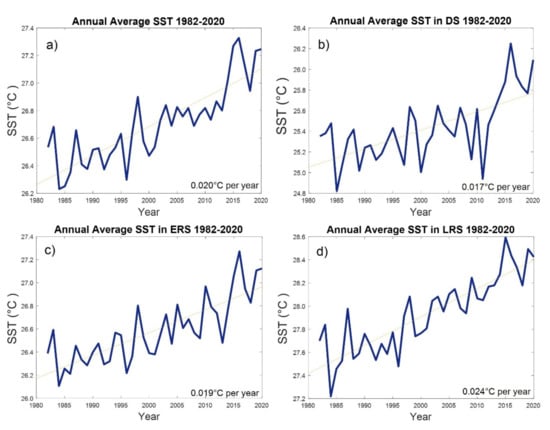 Summary of regional (spatial) averaged trends from 1982–2020: (a) annual regional average SST time series for the Caribbean and surrounding region, (b) regional average of SST in the Dry Rainfall Season, (c) regional average of SST in the Early Rainfall Season, and (d) regional average of SST in the Late Rainfall Season.