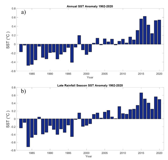 Caribbean and surrounding region sea surface temperature anomalies observation: (a) annual SST anomaly 1982–2020 and (b) Late Rainfall Season SST anomaly 1982–2020.