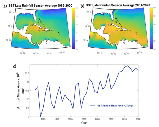 The Caribbean and surrounding region continues to reflect a warming trend since those last reported by Glenn et al. [14] and more recently by The Climate Studies Group of UW-Mona [51]. The LRS, the season when SSTs are warmest for this region, is warming at a faster rate than other seasons. Increases in SSTs during the LRS are of particular importance because temperatures during this season reach 26.5 °C and above, which is the threshold generally considered for deep convection. Moreover, convection intensity rapidly increases when SSTs increase from 26.5 to 29.5 °C and the LRS reflects an increase in the size and presence of SSTs that reach this favorable range.