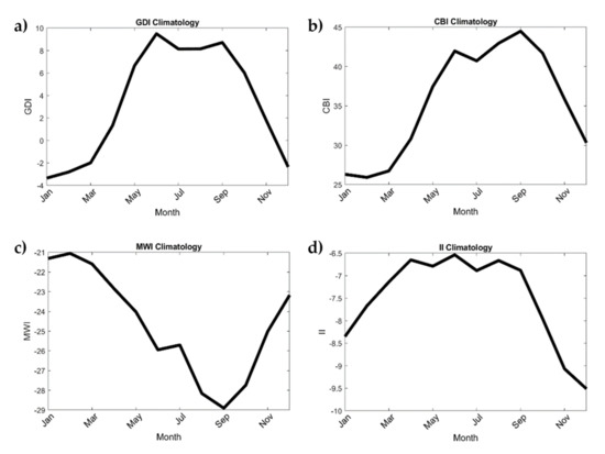 Regional climatology results show that the GDI exhibits a bimodal pattern similar to the characteristic bimodal precipitation pattern experienced in the Caribbean and surrounding region, seen in Figure 5. This is an interesting finding given the apparent independence of the variables. Additionally, the climatology for heat and moisture (CBI) is also bimodal as the annual precipitation cycle in this region is dependent on heat and moisture availability. The climatology results for each sub-index (CBI, MWI, and II) are shown in Figure 6.